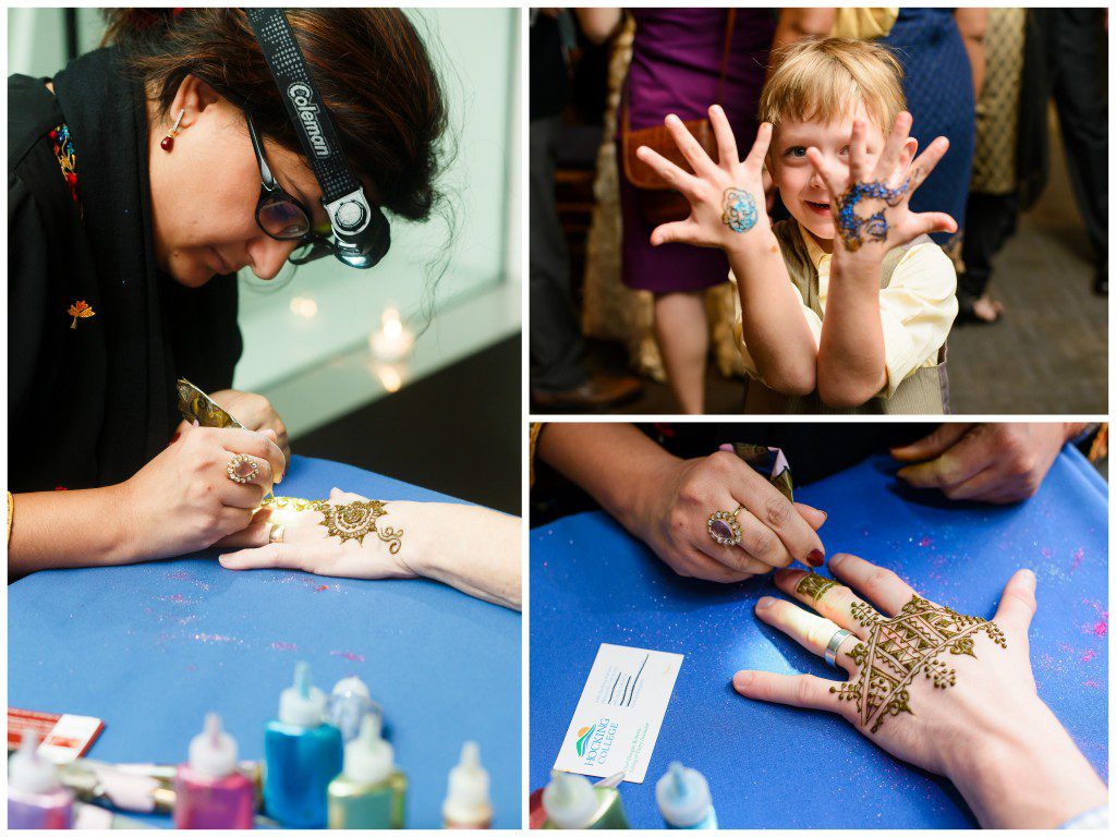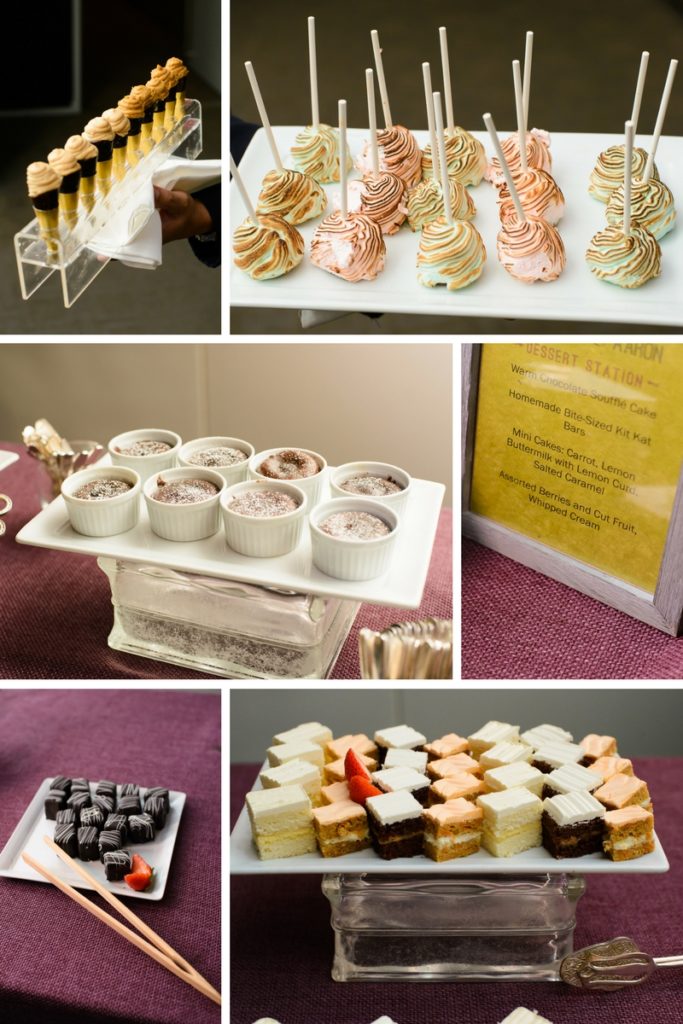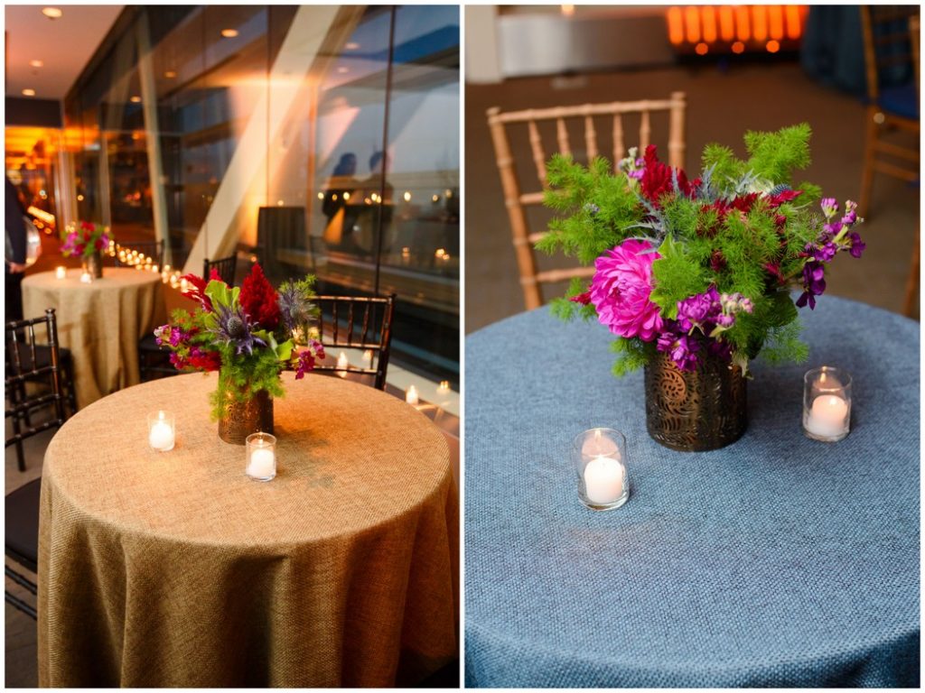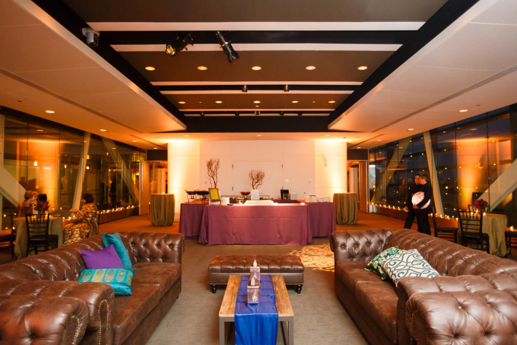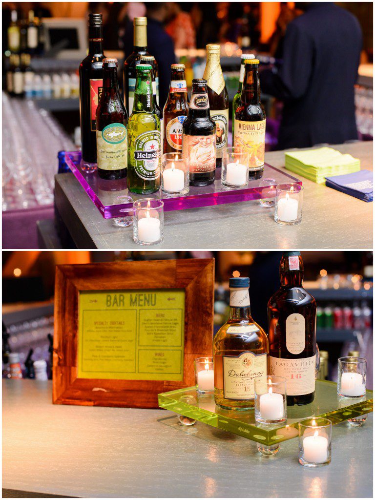 Our couple wanted a warm feel with elements inspired by nature, mixed with rich jewel tone colors and a splash of Indian inspired motifs to honor the bride’s heritage in the event design. With two rooms, one room became a more relaxing lounge space while the other had a more upbeat feel with a focus on the bar and the dance floor. Variety was the name of the game when it came to the food and beverage options. At the bar, guests could choose from 4 signature cocktails, 5 craft beers, 2 scotches, in addition to standard beverage options. They served a delicious selection of passed hors d’oeuvres and desserts, as well as savory stations.