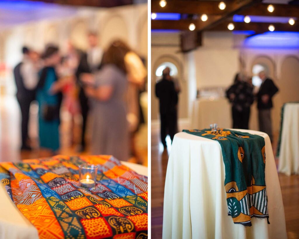 - On cocktail tables, we topped them with colorful fabrics sourced from South Africa