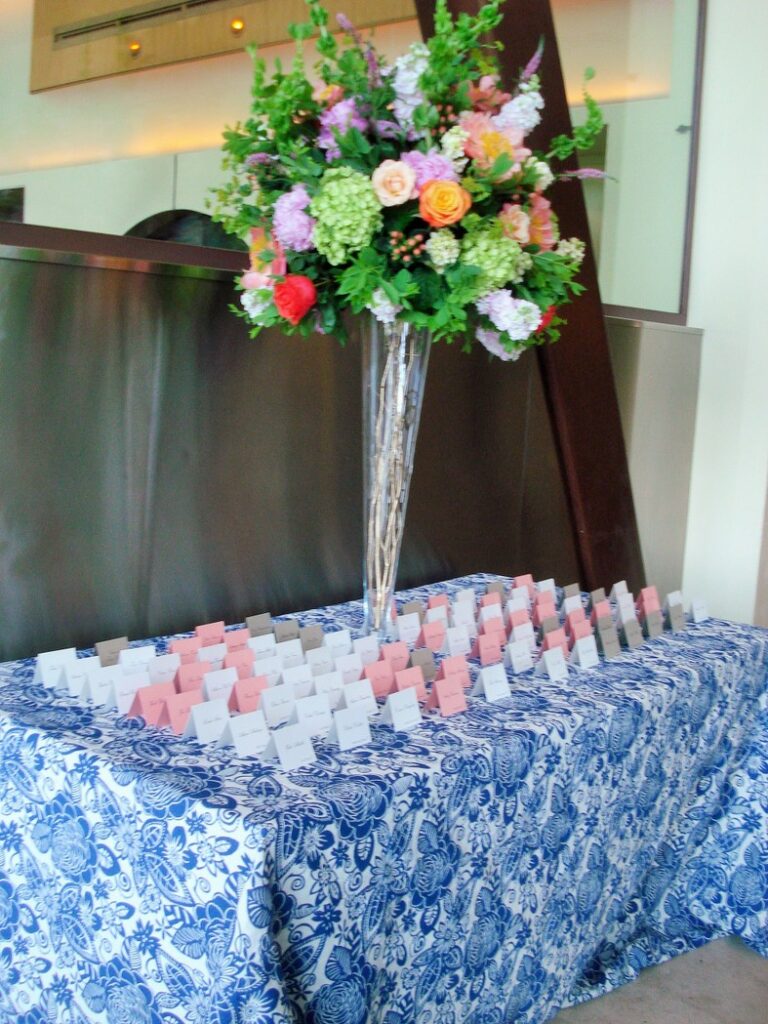 Highlights. Our design for this wedding was inspired by baseball in the summer, a sport the couple loved, but we didn’t want the style to be too literal. Tables were named after baseball stadiums, using fonts that were reminiscent of those found on jerseys. The round shape of the baseball drove our design selections also. The tables were dressed in a gold-dots linens with a splash of blue provided by the napkins. We used round tables and round menu cards at each place setting. Since their wedding day was on the summer solstice, we used bright colors such as corals, pinks, peach, and blues.